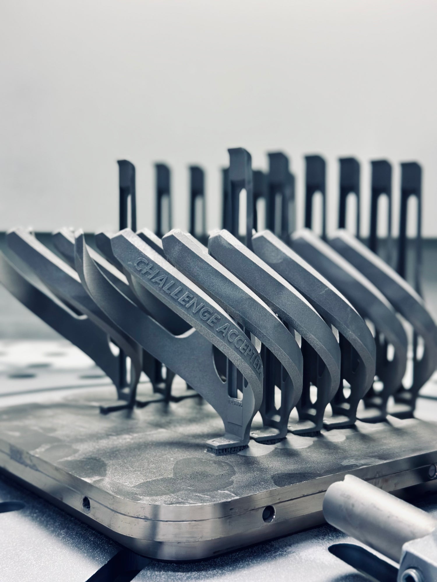 The individually designed "Challenge accepted!" bottle cage variant not only shows the possibilities of personalization, but also different surface finishes. Extruded text, hand-sanded and anodized in the customer's color. 3D printing and titanium make almost anything possible!